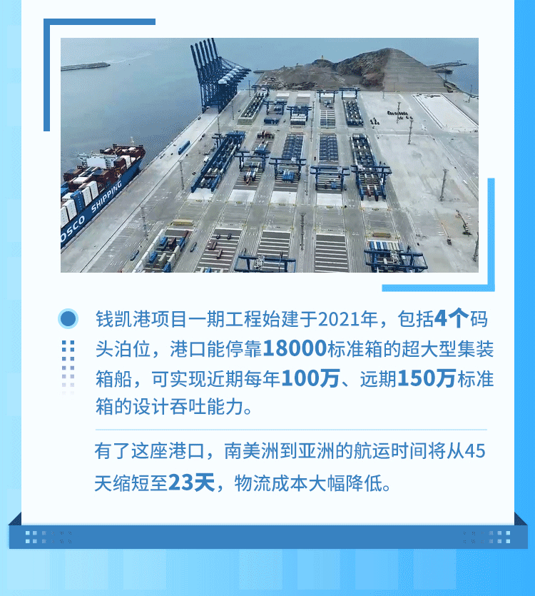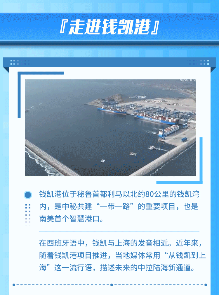 錢凱港位于秘魯首都利馬以北80公里,是中秘共建“一帶一路”重點項目。開港后,中秘間單程海運時間將縮短至23天,節(jié)約20%以上的物流成本,每年將為秘魯創(chuàng)造逾8000個直接就業(yè)機會。