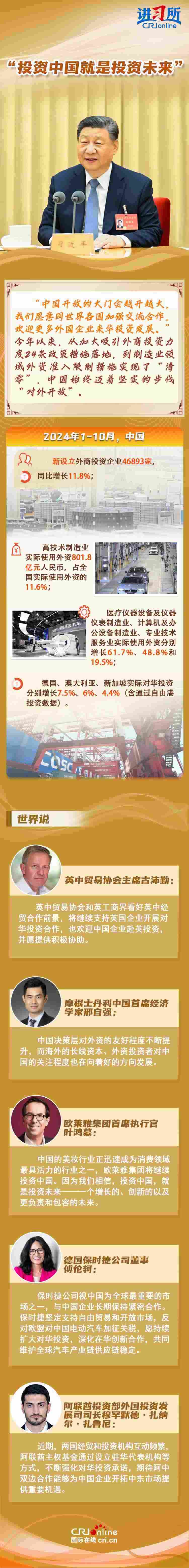 “中國是實干家、行動派。”今年以來,從習近平主席的歐洲之行到拉美之行,再到四天前在北京會見主要國際經(jīng)濟組織負責人,習近平一直強調,中國的發(fā)展將給世界帶來巨大機遇。據(jù)聯(lián)合國貿易和發(fā)展會議不久前發(fā)布的《世界投資報告2024》中文版顯示,中國吸引外資的結構不斷優(yōu)化、質量不斷提高,多位政商界人士也認為中國是一個非常有前景的市場,投資中國就是投資未來。