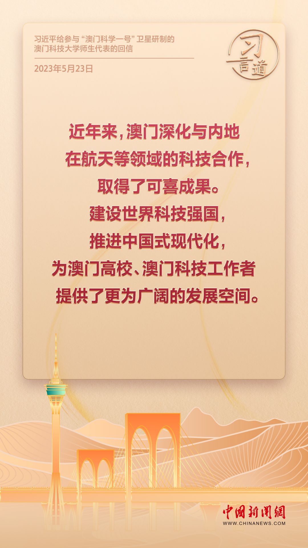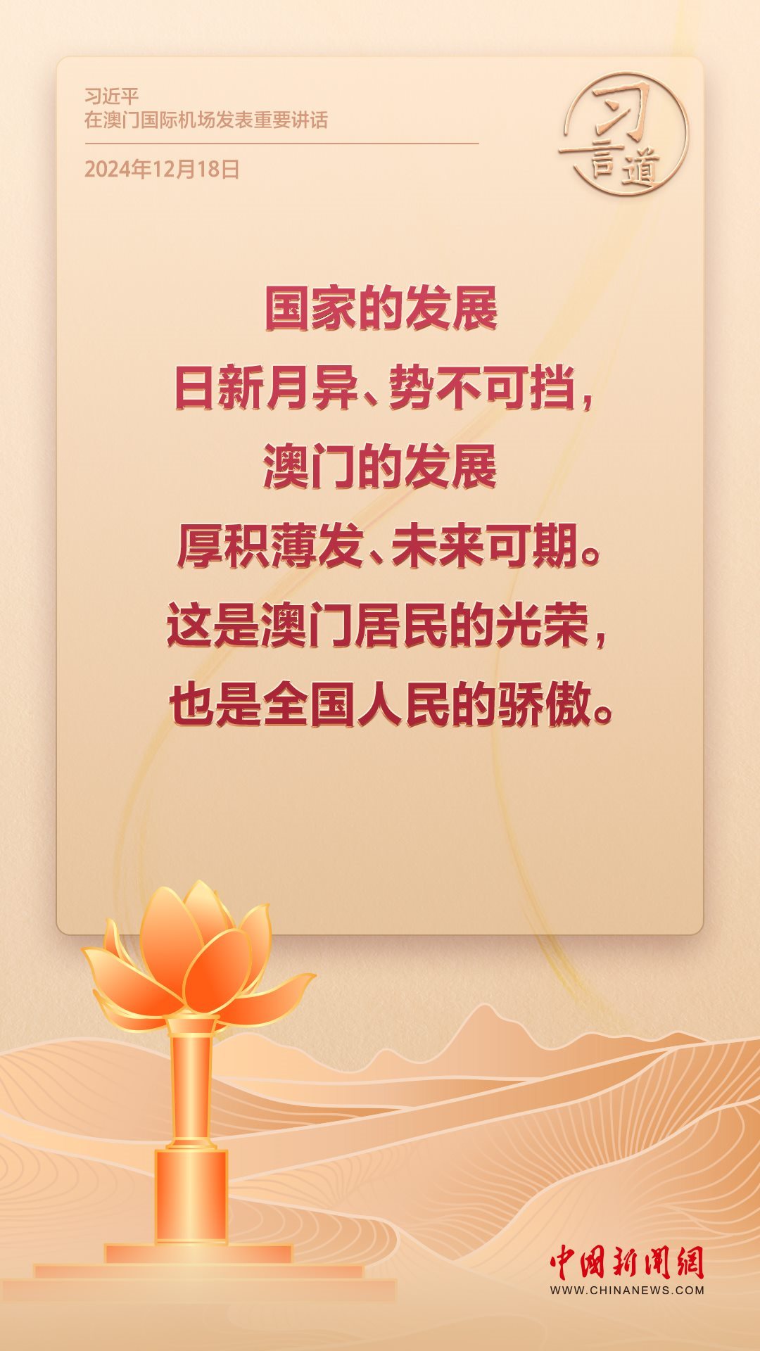 2024年是澳門回歸祖國25周年。多年來,習(xí)近平主席始終關(guān)注澳門經(jīng)濟社會發(fā)展、百姓福祉,寄語“澳門的發(fā)展厚積薄發(fā)、未來可期”。