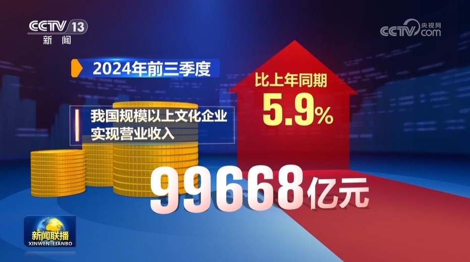 數(shù)據(jù)顯示,今年前三季度,我國規(guī)模以上文化企業(yè)實(shí)現(xiàn)營業(yè)收入99668億元,比上年同期增長5.9%。其中,文化新業(yè)態(tài)行業(yè)實(shí)現(xiàn)營業(yè)收入41616億元,比上年同期增長10.0%。