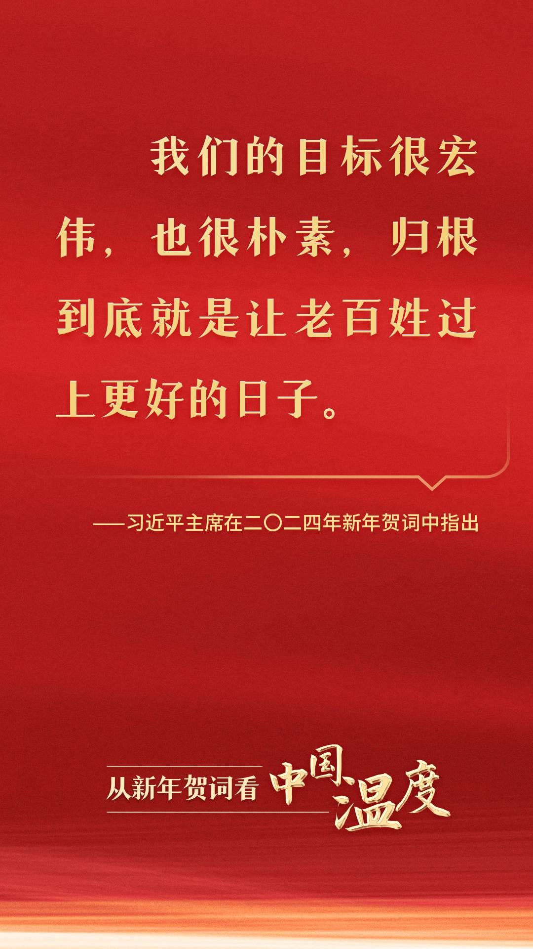 從黃土地走來,從大隊黨支部書記到黨和國家最高領導人,習近平同志深諳國情、社情、民情。在二〇二四年新年賀詞中,習近平主席話語懇切:“我們的目標很宏偉,也很樸素,歸根到底就是讓老百姓過上更好的日子。”