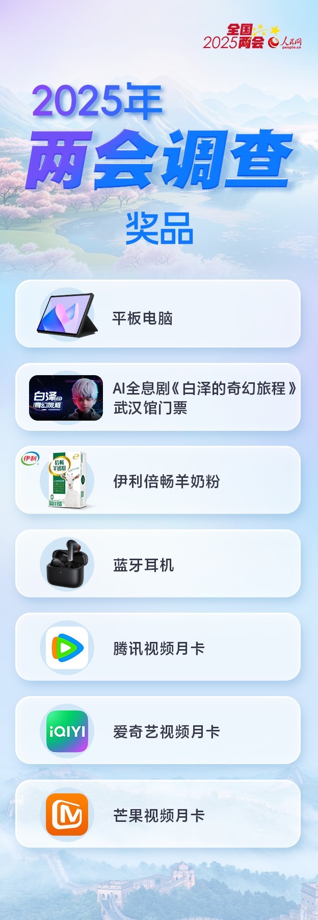 為感謝網(wǎng)友對(duì)人民網(wǎng)2025年全國(guó)兩會(huì)調(diào)查的支持,參與者有機(jī)會(huì)抽取精美獎(jiǎng)品1份。