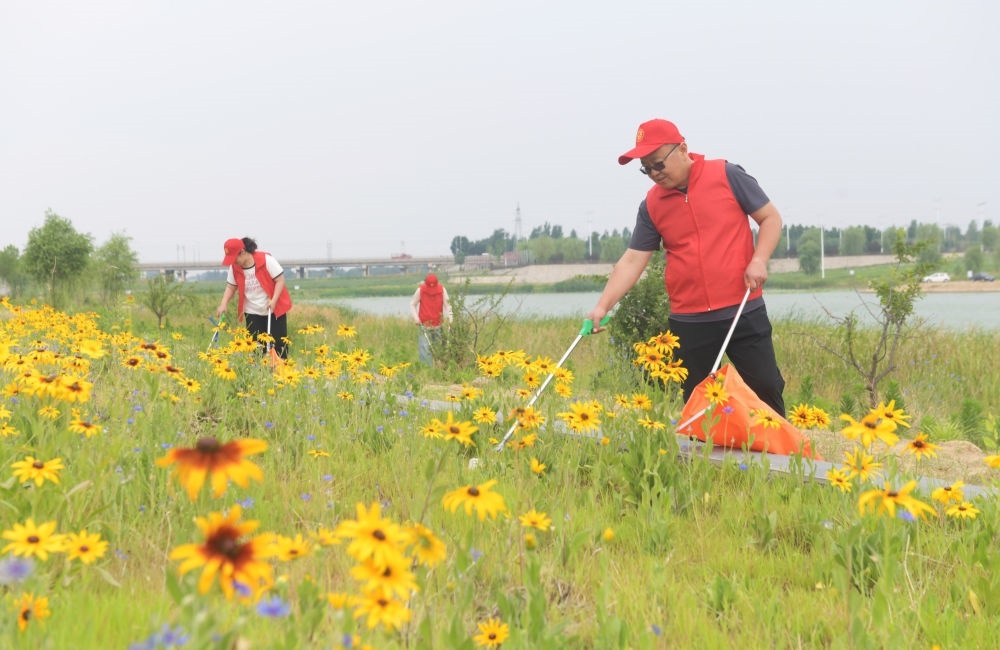 2024年6月5日,環(huán)保志愿者在河北省石家莊新樂市磁河木刀溝生態(tài)濕地撿拾垃圾。