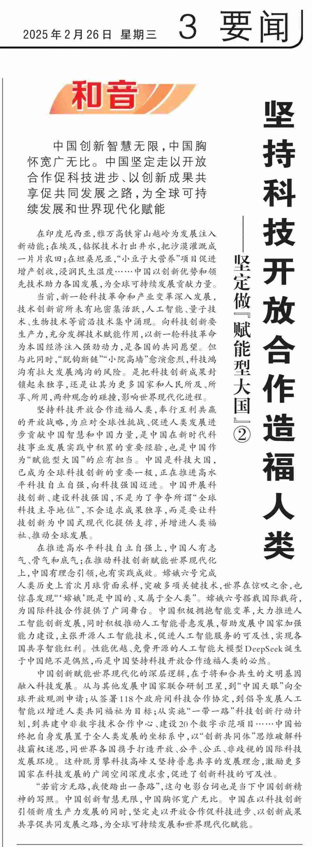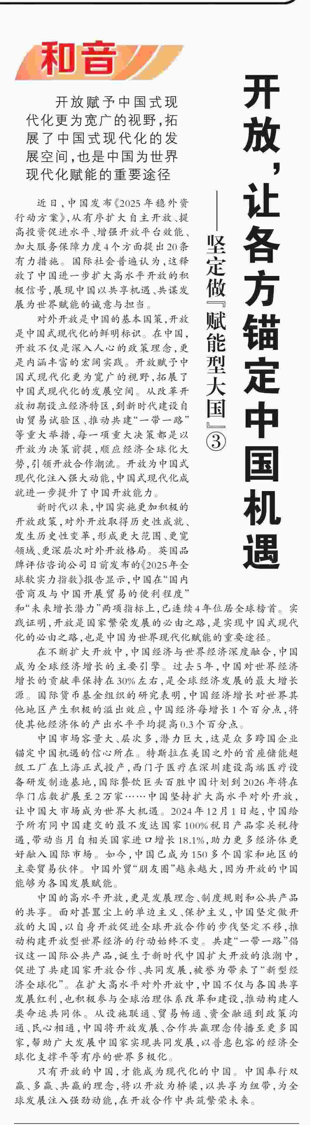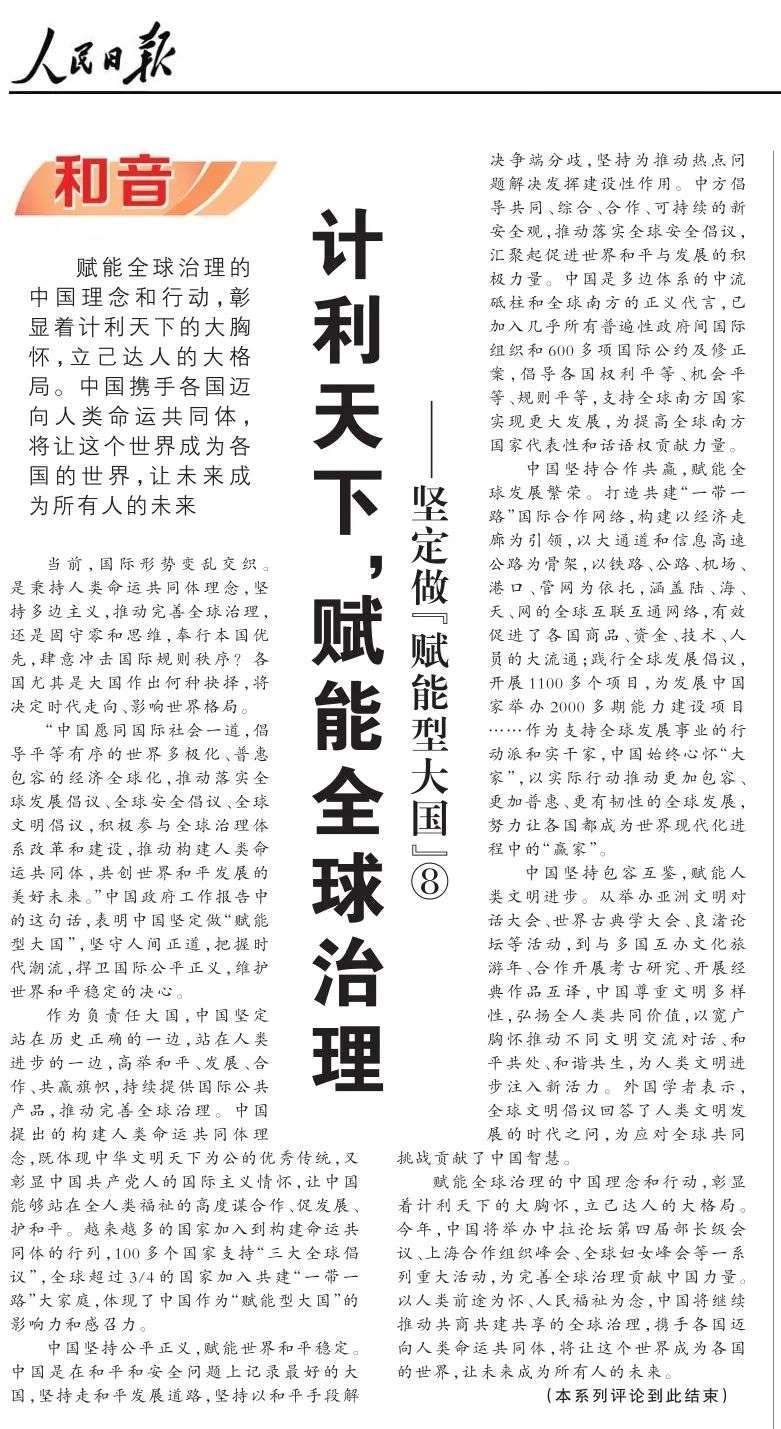 近期,《人民日報(bào)》“和音”欄目推出“堅(jiān)定做‘賦能型大國’”系列評論,圍繞科技創(chuàng)新、開放共贏、綠色轉(zhuǎn)型、高質(zhì)量共建“一帶一路”、多邊治理等熱點(diǎn)議題,從不同角度闡釋中國何以成為一個(gè)“賦能型大國”的深層邏輯,展現(xiàn)中國始終秉持構(gòu)建人類命運(yùn)共同體理念,不斷以中國式現(xiàn)代化為世界現(xiàn)代化賦能的大國擔(dān)當(dāng)。