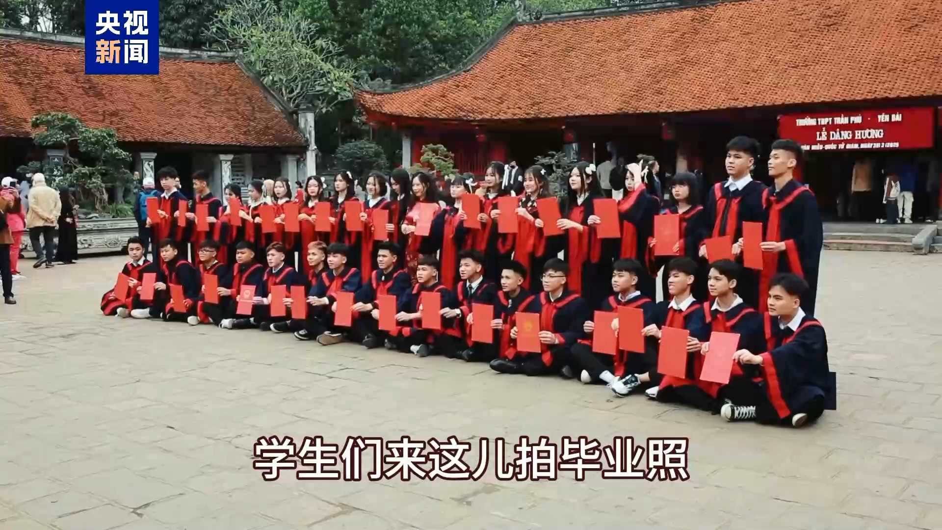 越南女學(xué)生:因為這里是一個神圣的地方,學(xué)生們來這兒拍畢業(yè)照,大家來文廟祭拜,希望能取得更好的學(xué)習(xí)成績。