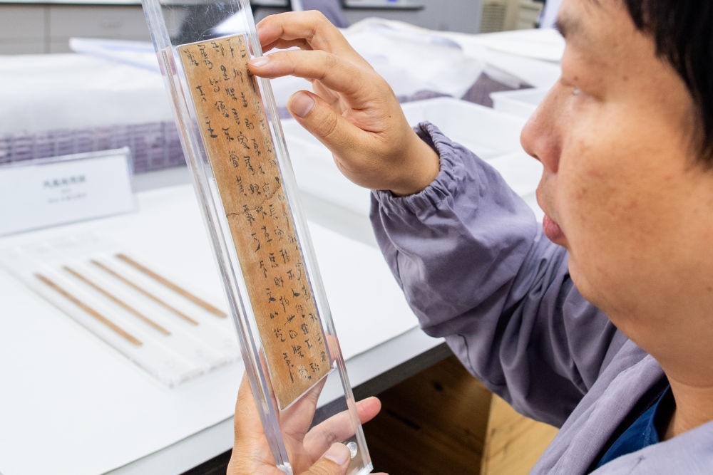 2023年5月20日,湖北荊州文物保護(hù)中心的修復(fù)人員史少華在查看修復(fù)完成的簡(jiǎn)牘。荊州文物保護(hù)中心是我國(guó)簡(jiǎn)牘修復(fù)領(lǐng)域?qū)嵙ψ顝?qiáng)的機(jī)構(gòu)之一,近年來累計(jì)完成13萬(wàn)多枚竹木簡(jiǎn)牘的脫水工作,飽水簡(jiǎn)牘修復(fù)量占全國(guó)90%以上。