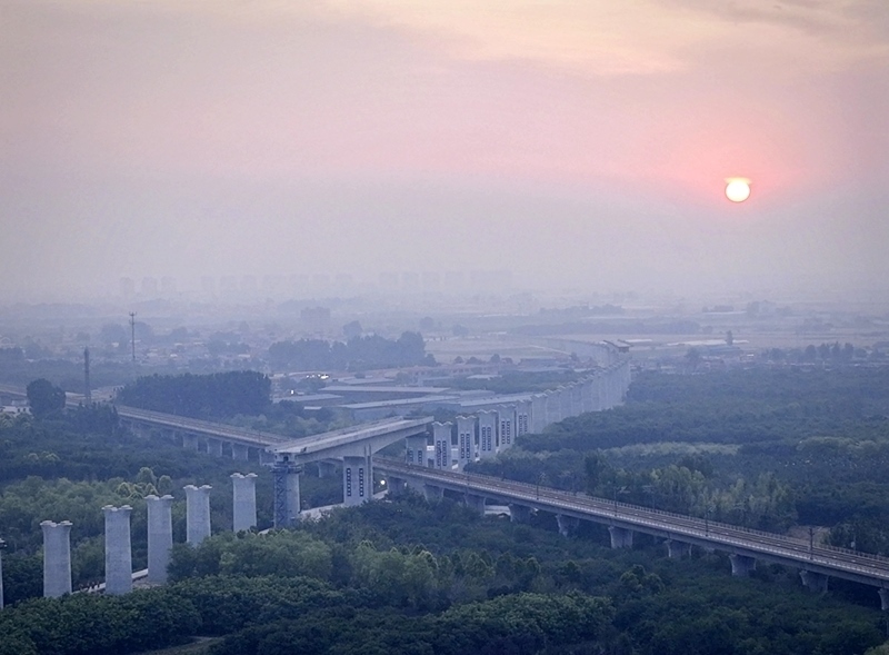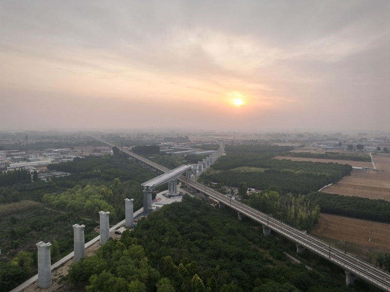 轉(zhuǎn)體前的雄忻高鐵雄保段跨京廣高鐵轉(zhuǎn)體橋(6月17日攝,無(wú)人機(jī)照片)。