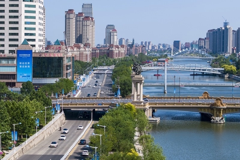 天津市南開區(qū)的一處人行天橋上懸掛著2025夏季達沃斯論壇宣傳標語(6月21日攝,無人機照片)。