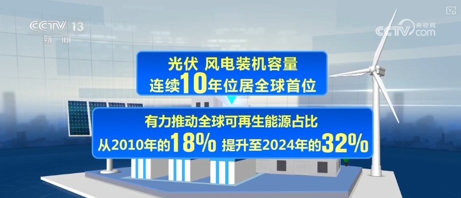 《報告》指出,作為全球最大能源消費國與清潔能源投資國,2024年,中國清潔能源投資規(guī)模為6250億美元,占全球比重的三分之一。光伏、風電裝機容量連續(xù)10年位居全球首位,有力推動全球可再生能源占比從2010年的18%提升至2024年的32%。