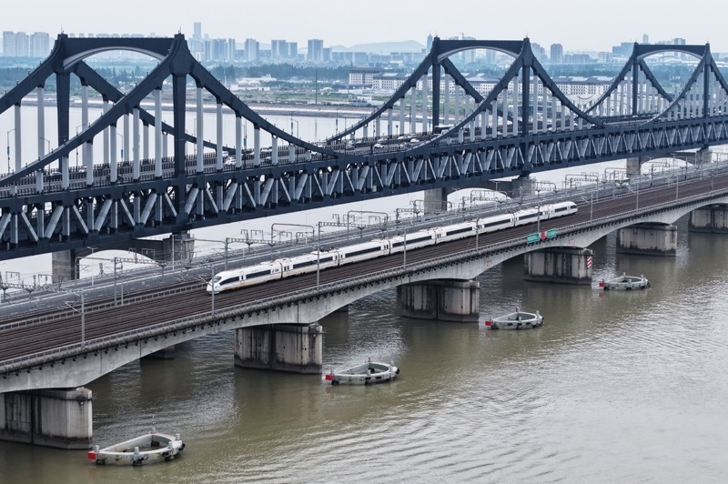 6月30日,動車組列車駛出南京動車段南京南動車運用所(無人機(jī)照片)。