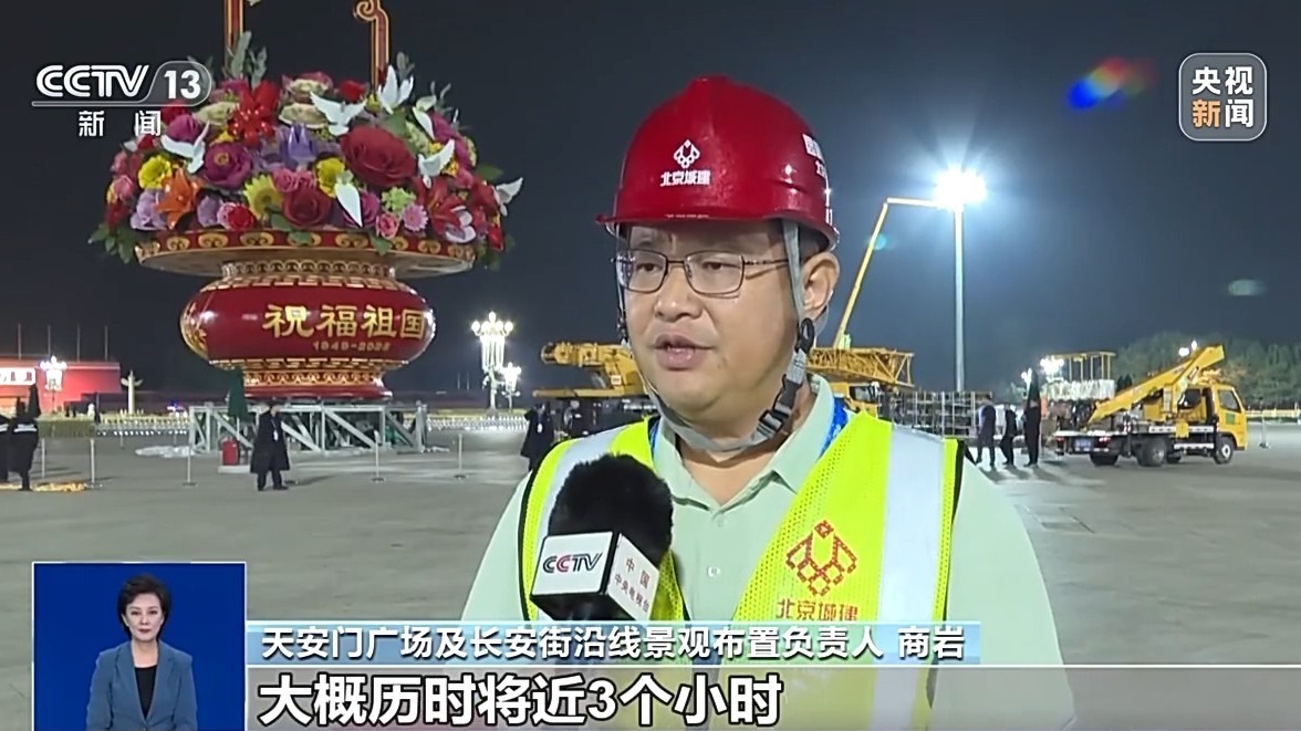 天安門廣場(chǎng)及長(zhǎng)安街沿線景觀布置負(fù)責(zé)人 商巖:從吊裝準(zhǔn)備工作開(kāi)始,一直到吊裝完成,大概歷時(shí)將近3個(gè)小時(shí)。保證籃盤和籃體的緊密結(jié)合,因?yàn)榛ɑ@在插置的過(guò)程中有一個(gè)觀賞角度,所以在吊裝和合龍整個(gè)過(guò)程當(dāng)中,四面相應(yīng)的觀賞面都要有工作人員要盯著,這個(gè)面不能有任何的變化。