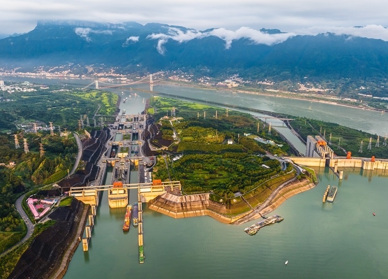 7月1日,在湖北宜昌,船舶有序通過(guò)三峽雙線五級(jí)船閘和升船機(jī)(無(wú)人機(jī)照片)。