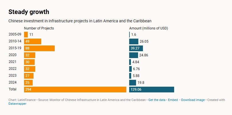 中國在拉丁美洲和加勒比地區(qū)投資基礎(chǔ)設(shè)施項目(來源:《拉美金融》)