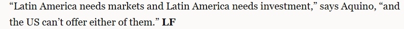 文章指出,并非所有人都對拉美與中國之間的合作感到滿意。華盛頓尤其擔心。不過,許多人認為華盛頓影響拉丁美洲的能力有限。文章援引利馬國立圣馬科斯大學(xué)的亞洲經(jīng)濟專家卡洛斯·阿基諾的話指出,“拉丁美洲需要市場和投資,但美國無法提供其中任何一項”。