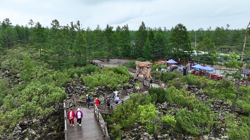 7月5日,游客在內(nèi)蒙古阿爾山國家森林公園石塘林景區(qū)游玩(無人機(jī)照片)。