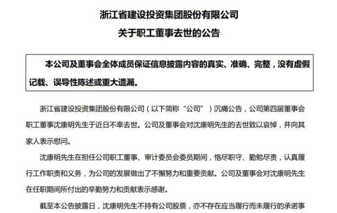 浙江省建設(shè)投資集團股份有限公司(下稱“浙江建投”)(002761.SZ)于7月3日公告稱,集團職工董事沈康明于近日不幸去世,年僅54歲。