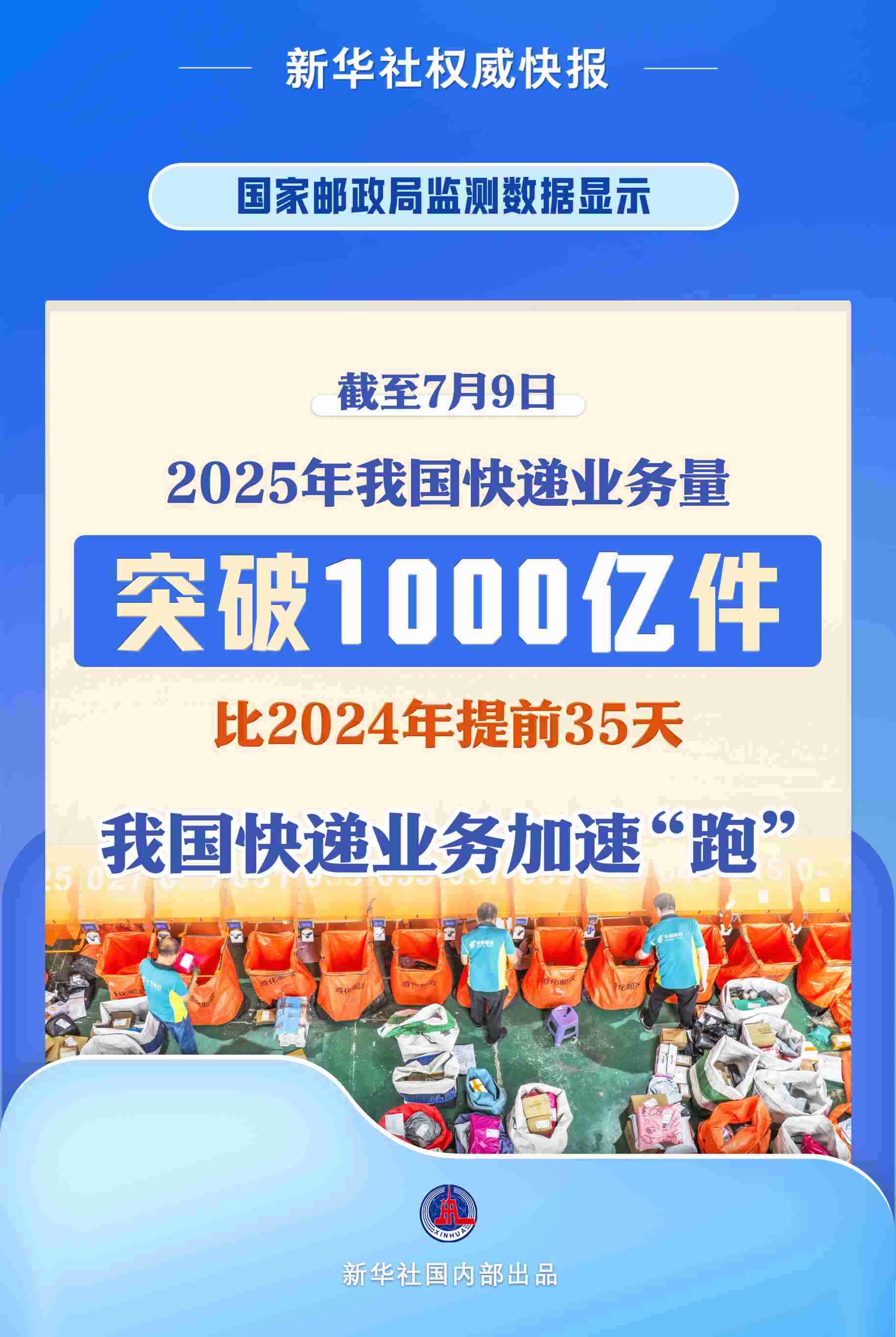 新華社北京7月10日電(記者葉昊鳴)記者10日從國家郵政局了解到,根據(jù)國家郵政局監(jiān)測數(shù)據(jù)顯示,截至7月9日,2025年我國快遞業(yè)務(wù)量突破1000億件,比2024年達(dá)到千億件提前35天。