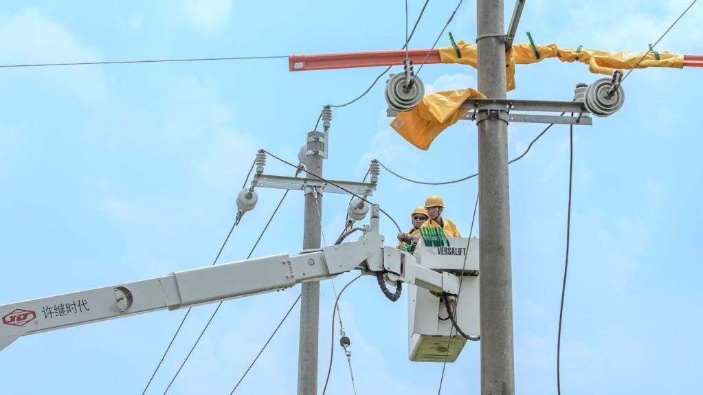 國網(wǎng)荊州供電公司電力工人正在帶電作業(yè)。(陳子才 攝)