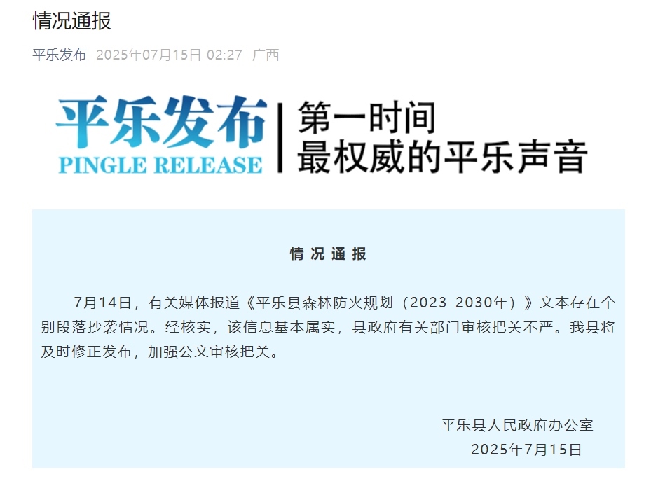 7月14日,有關媒體報道《平樂縣森林防火規(guī)劃(2023-2030年)》文本存在個別段落抄襲情況。經(jīng)核實,該信息基本屬實,縣政府有關部門審核把關不嚴。我縣將及時修正發(fā)布,加強公文審核把關。