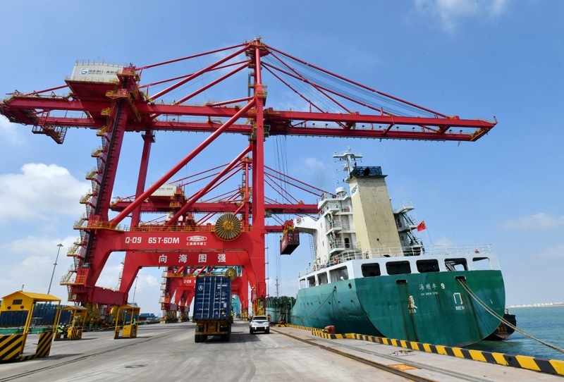 7月16日,工人在黃驊港綜合港區(qū)集裝箱碼頭操作吊裝設(shè)備進(jìn)行裝船作業(yè)。