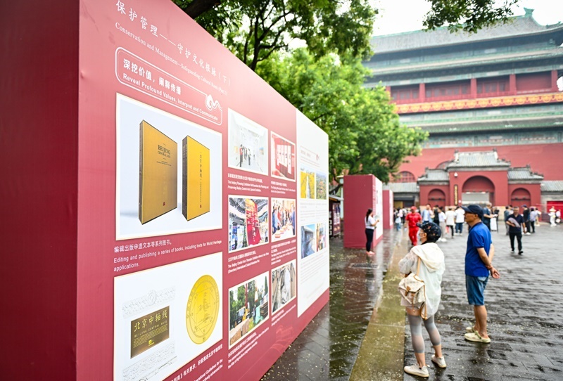 這是7月27日在北京鐘樓前拍攝的北京中軸線世界文化遺產(chǎn)標(biāo)志碑。