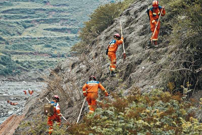 8月9日,甘肅省森林消防總隊(duì)消防員、國(guó)家西北區(qū)域應(yīng)急救援中心指戰(zhàn)員攜帶救援裝備,在山區(qū)展開搜索。