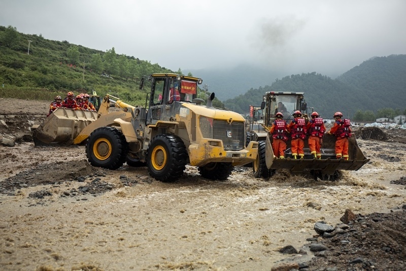 8月9日,國(guó)家西北區(qū)域應(yīng)急救援中心指戰(zhàn)員在馬坡鄉(xiāng)舊莊溝村依托大型機(jī)械渡河開展搜救工作。