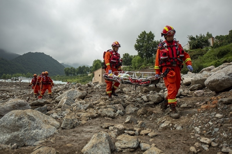 8月9日,國(guó)家西北區(qū)域應(yīng)急救援中心指戰(zhàn)員在馬坡鄉(xiāng)舊莊溝村攜帶救援擔(dān)架沿河道搜救失聯(lián)人員。