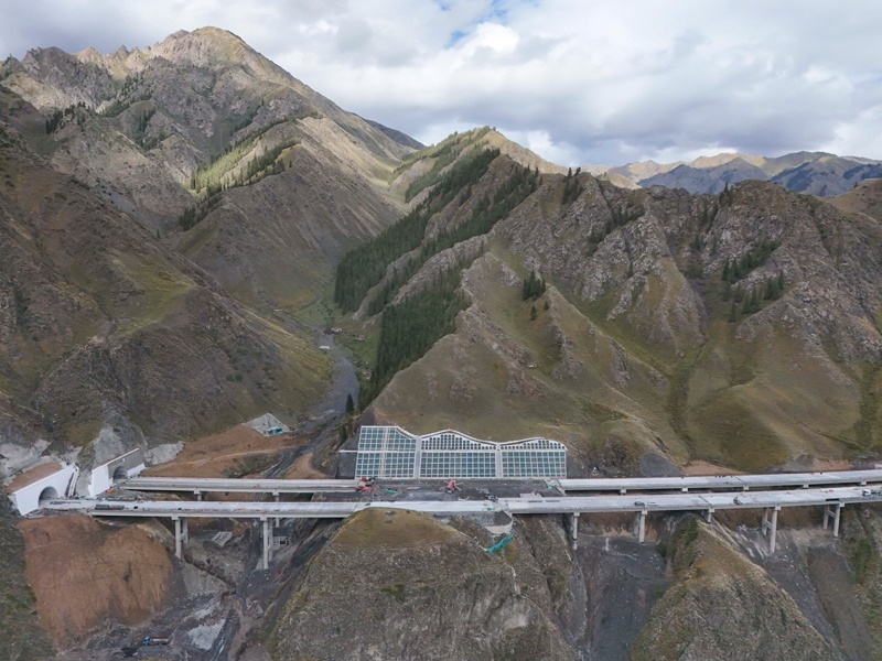 工人在新疆烏尉高速公路躍進(jìn)3號(hào)隧道南端施工(8月19日攝,無(wú)人機(jī)照片)。