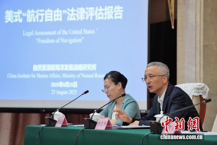 8月25日,中國自然資源部海洋發(fā)展戰(zhàn)略研究所在北京發(fā)布《美式“航行自由”法律評估報告》中英文版。該《報告》旨在對美國“航行自由”相關(guān)主張和實踐是否符合國際條約和一般國際法、是否具備法律基礎(chǔ)進行評估。圖為自然資源部海洋發(fā)展戰(zhàn)略研究所前所長張海文(右二)答記者問。中新社記者 張祥毅 攝