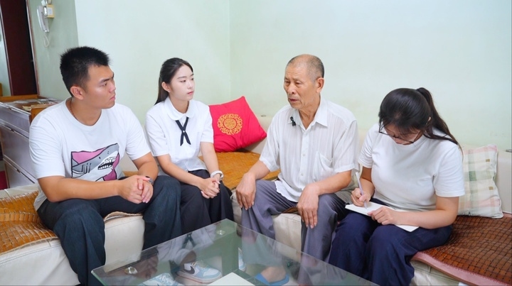 楊村幸存村民王玉璽向?qū)ぴL團(tuán)比劃當(dāng)年嘴部中彈的經(jīng)過