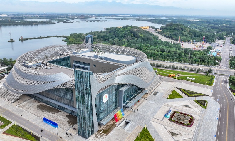 這是8月28日在寧夏銀川市拍攝的第七屆中國(guó)—阿拉伯國(guó)家博覽會(huì)開幕式舉辦地——寧夏國(guó)際會(huì)堂外景(無人機(jī)照片)。