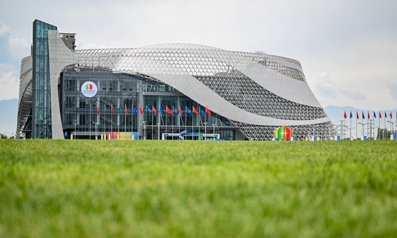 這是8月28日在寧夏銀川市拍攝的第七屆中國(guó)—阿拉伯國(guó)家博覽會(huì)開幕式會(huì)場(chǎng)外景。
