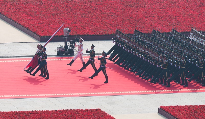 9月3日,紀(jì)念中國人民抗日戰(zhàn)爭暨世界反法西斯戰(zhàn)爭勝利80周年大會在北京隆重舉行。這是走向旗桿基座的國旗護衛(wèi)隊。