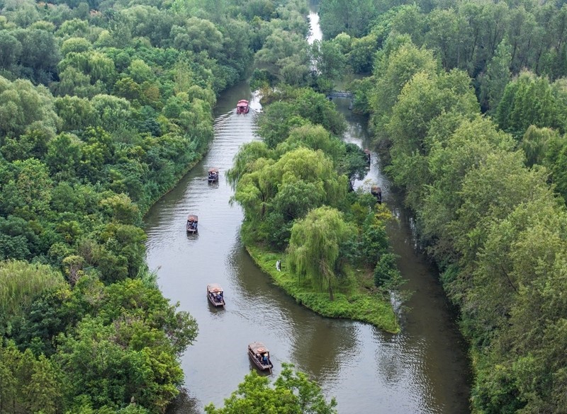 10月1日,游客在江蘇省泰州市姜堰區(qū)溱湖國家濕地公園乘船游玩(無人機(jī)照片)。