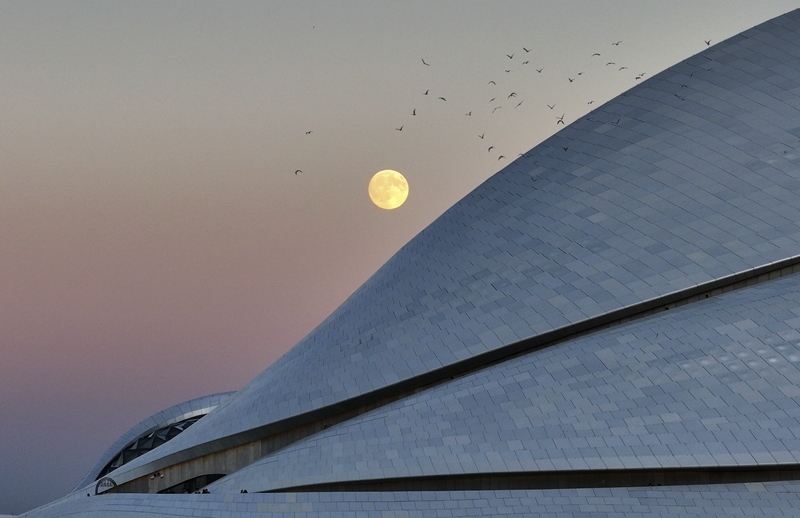 10月6日在黑龍江省哈爾濱大劇院拍攝的中秋滿月(無人機(jī)照片)。