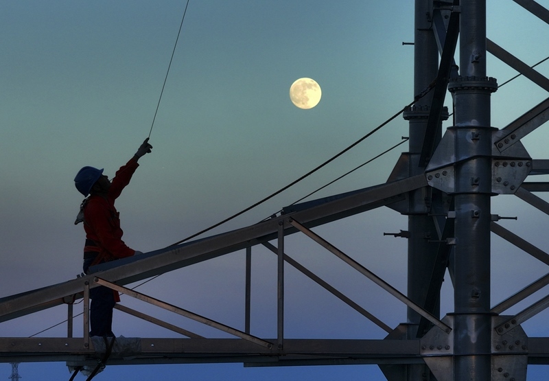 10月6日,在湖南省衡陽市雁峰區(qū),高塔架線工人在月光的映射下施工(無人機(jī)照片)。