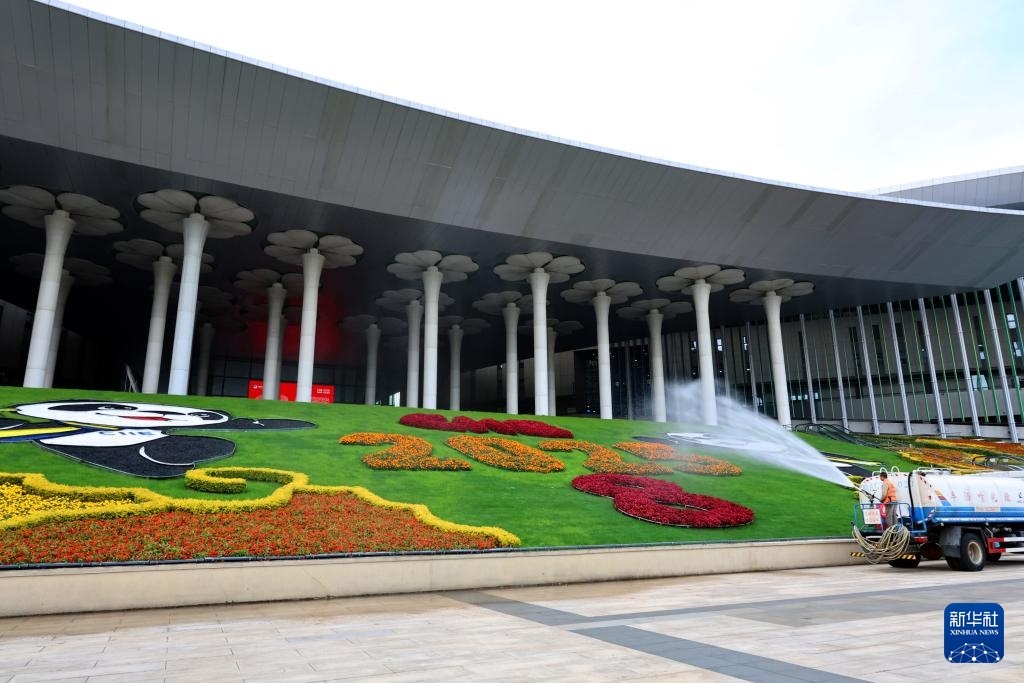 11月3日,工作人員在為國家會展中心(上海)南廣場裝飾綠化噴水。