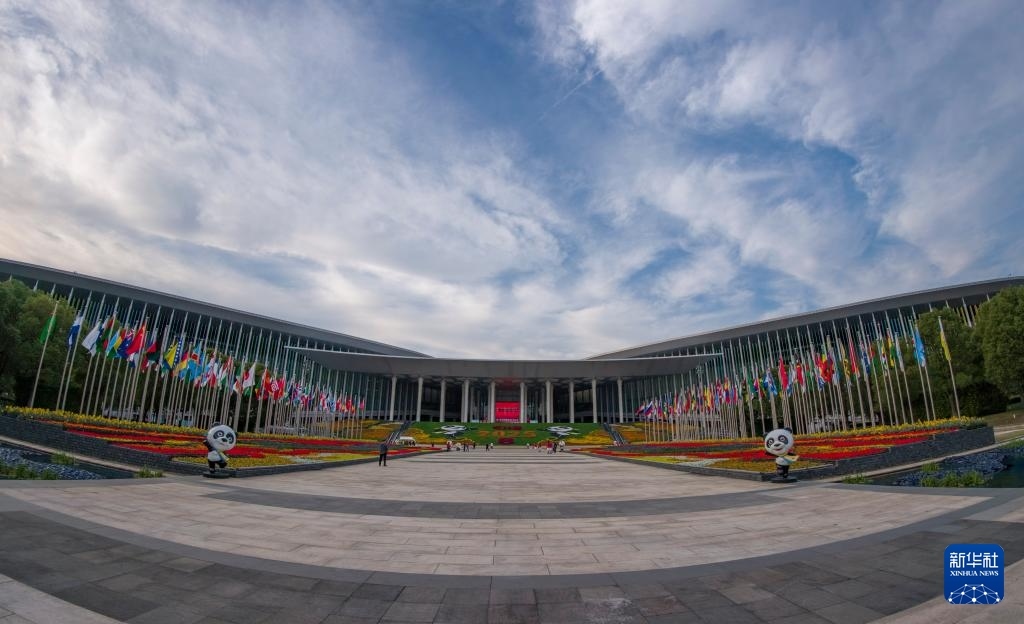 這是裝飾一新的國家會展中心(上海)南廣場(11月3日攝)。