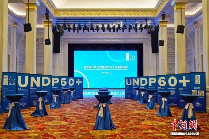 11月13日,聯(lián)合國(guó)開(kāi)發(fā)計(jì)劃署在北京舉行成立60周年招待會(huì),回顧在華合作歷程,重申將繼續(xù)深化合作,攜手推動(dòng)可持續(xù)發(fā)展。圖為招待會(huì)現(xiàn)場(chǎng)。(UNDP供圖)