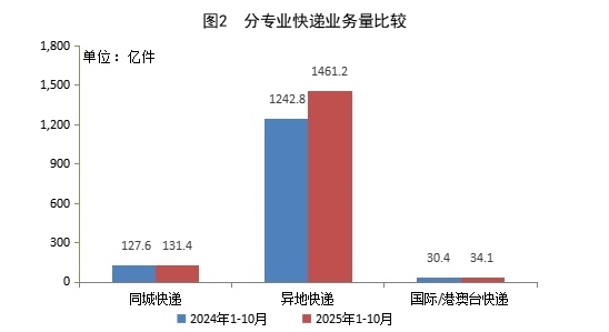 1—10月,同城快遞業(yè)務量累計完成131.4億件,同比增長3.0%;異地快遞業(yè)務量累計完成1461.2億件,同比增長17.6%;國際/港澳臺快遞業(yè)務量累計完成34.1億件,同比增長12.2%。