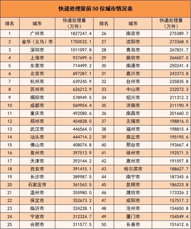 注:快遞處理量=快遞業(yè)務量+快遞投遞量