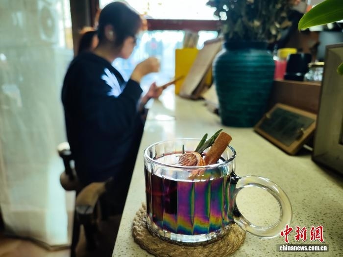 11月19日,在天津三七開咖啡酒館,一款以紅酒為基底,搭配香橙清甜與肉桂醇香的熱飲熱銷?!≈行律缬浾?佟郁 攝