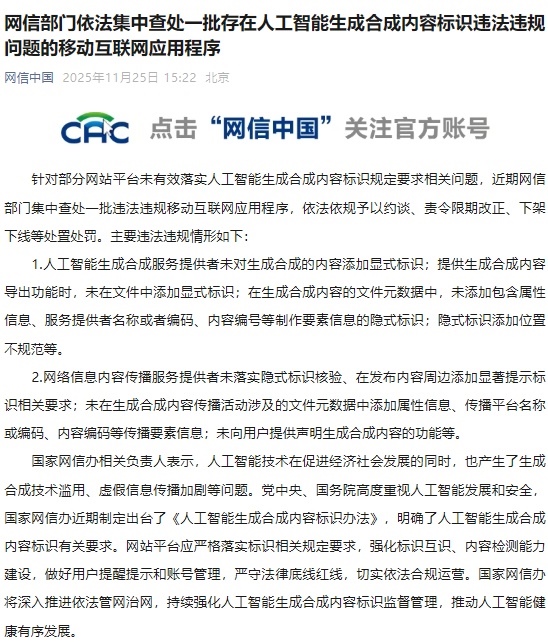 針對(duì)部分網(wǎng)站平臺(tái)未有效落實(shí)人工智能生成合成內(nèi)容標(biāo)識(shí)規(guī)定要求相關(guān)問(wèn)題,近期網(wǎng)信部門(mén)集中查處一批違法違規(guī)移動(dòng)互聯(lián)網(wǎng)應(yīng)用程序,依法依規(guī)予以約談、責(zé)令限期改正、下架下線等處置處罰。主要違法違規(guī)情形如下: