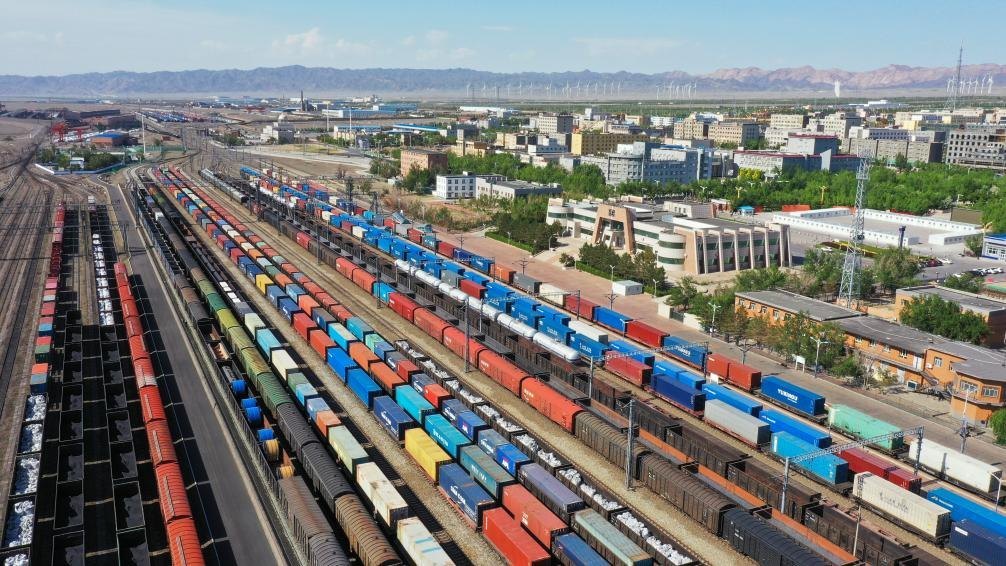 在新疆阿拉山口站寬準(zhǔn)軌編組場(chǎng),出入境中歐班列集結(jié)等待出發(fā)(2024年5月25日攝,無(wú)人機(jī)照片)。新華社發(fā)(于暉 攝)