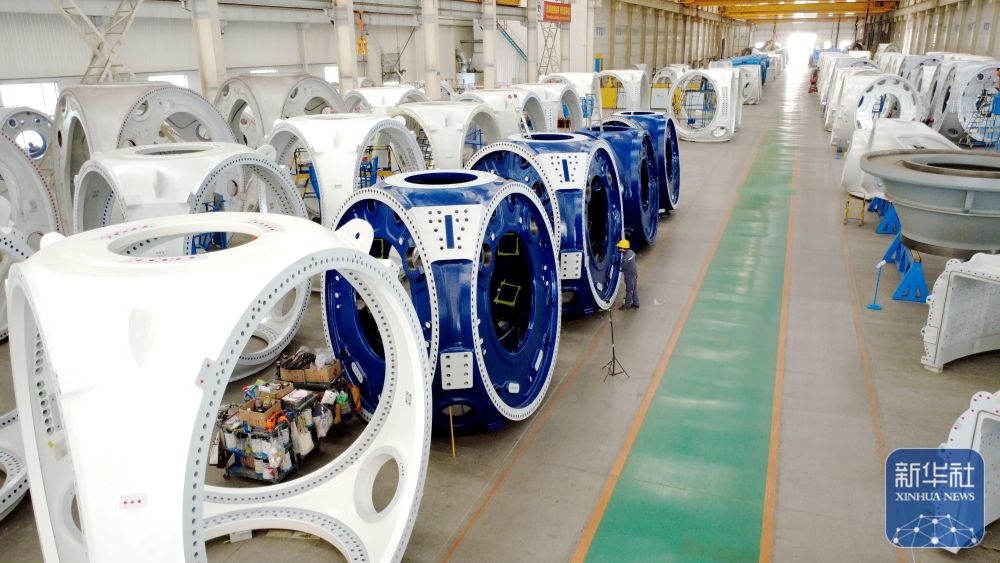 ↑ 12月15日,工人在山東省濱州市惠民經(jīng)濟開發(fā)區(qū)風電裝備產(chǎn)業(yè)園的車間清理風電輪轂(無人機照片)。新華社發(fā)(王軍攝)