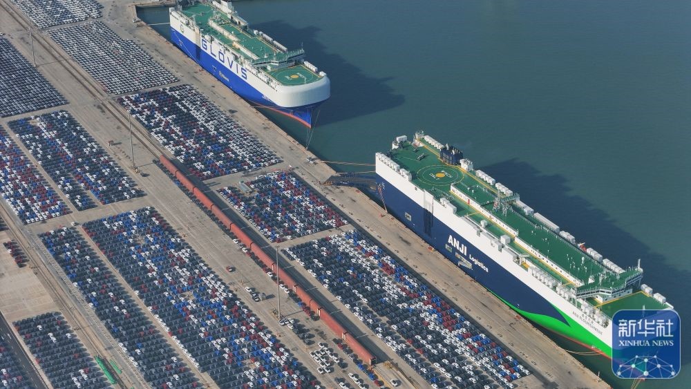 ↑ 12月14日在江蘇省港口集團南京港龍?zhí)都b箱碼頭拍攝的等待裝船出口的國產(chǎn)汽車(無人機照片)。新華社發(fā)(楊素平攝)