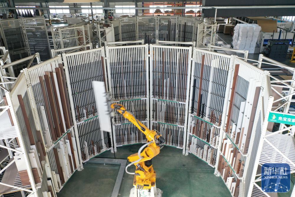 ↑ 12月15日,在位于浙江省湖州市德清縣乾元鎮(zhèn)的德華兔寶寶裝飾新材股份有限公司家居產(chǎn)業(yè)園,智能分揀機械臂在分揀家具板材(無人機照片)。新華社發(fā)(倪立芳攝)