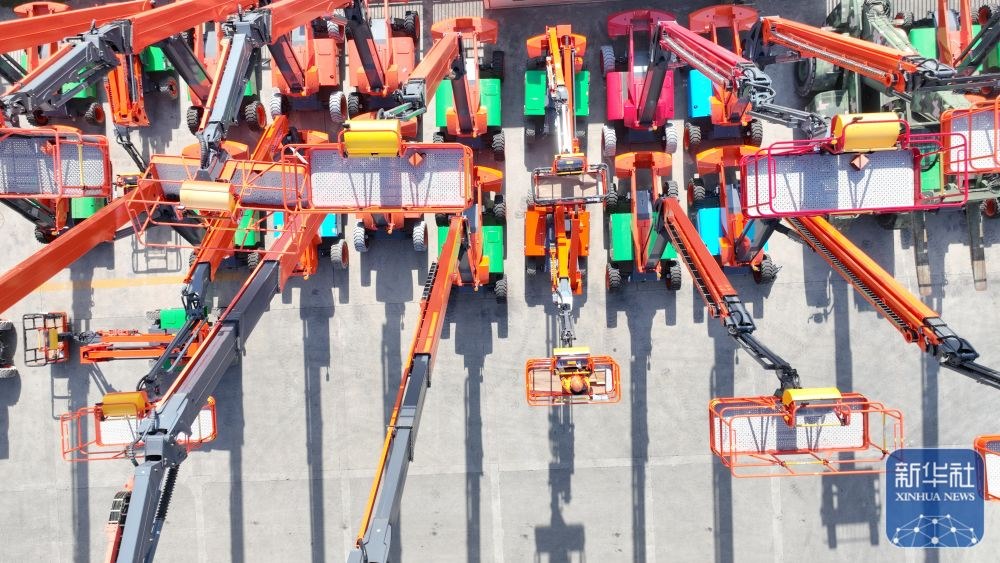 ↑ 12月15日,在位于浙江省湖州市德清縣雷甸鎮(zhèn)的浙江鼎力機械股份有限公司,工人對準備出口的新臂式智能高空作業(yè)平臺設(shè)備進行檢測(無人機照片)。新華社發(fā)(謝尚國攝)