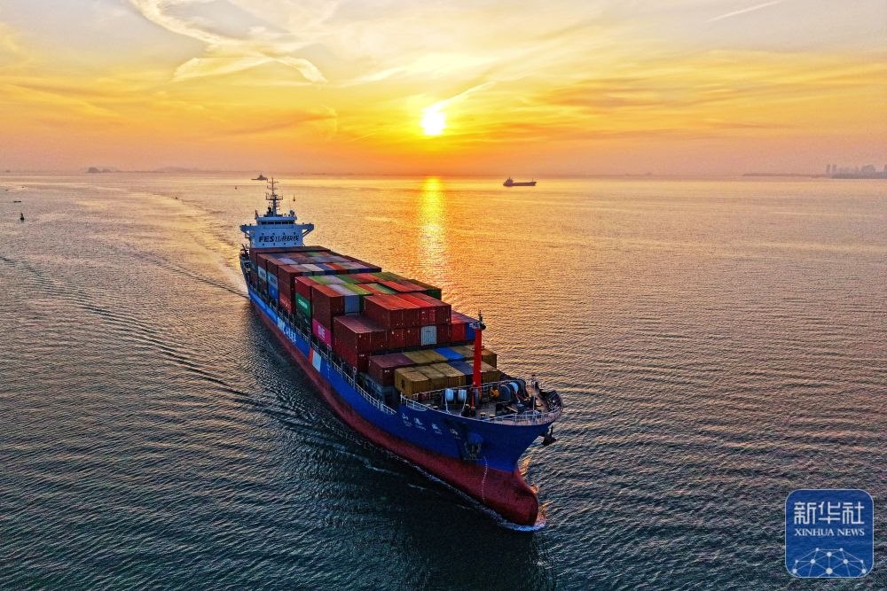 ↑ 12月15日,一艘集裝箱貨輪駛?cè)肷綎|港口煙臺港(無人機照片)。新華社發(fā)(孫文潭攝)